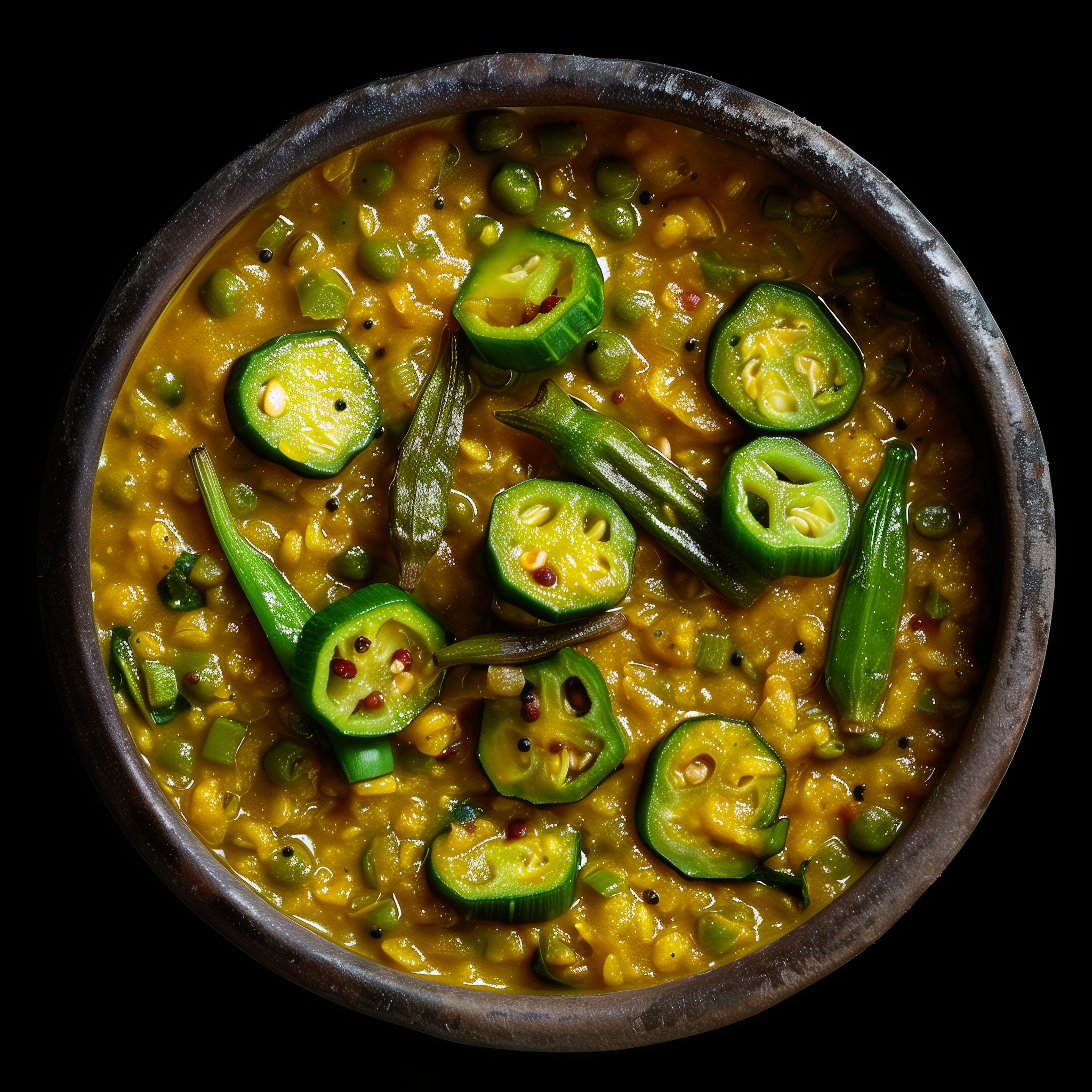 A heartwarming and nutritious dish that beautifully marries the earthiness of dal (lentils) with the unique texture of okra. This Indian curry is simmered to perfection, infusing the tender lentils and okra with a rich blend of aromatic spices like turmeric, cumin, and mustard seeds. The okra adds a slightly crisp texture and a subtle sweetness, complementing the creamy dal and creating a dish full of complex flavors and satisfying mouthfeel. Tomato and onion base add depth, while a hint of tamarind or lemon juice brings a welcome tanginess that balances the overall profile. Garnished with fresh cilantro, this Indian Dal Okra Curry is a testament to the comforting and diverse flavors of Indian cuisine, offering a nutritious, vegan-friendly meal that’s both comforting and delicious. Perfect served over rice or with flatbreads, it’s a delightful way to enjoy the fusion of textures and flavors that Indian cooking has to offer.